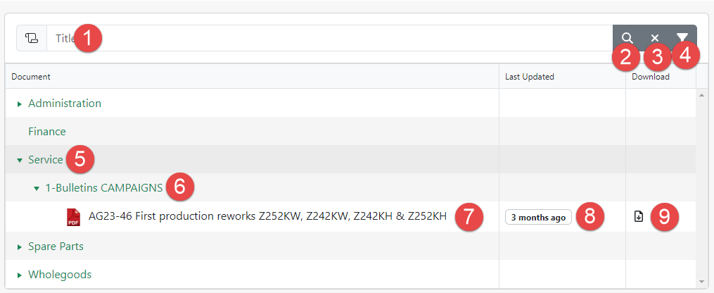 | 4 | Filters Button | This button opens the filter options to narrow down the dealer downloads search by document type and/or division. |