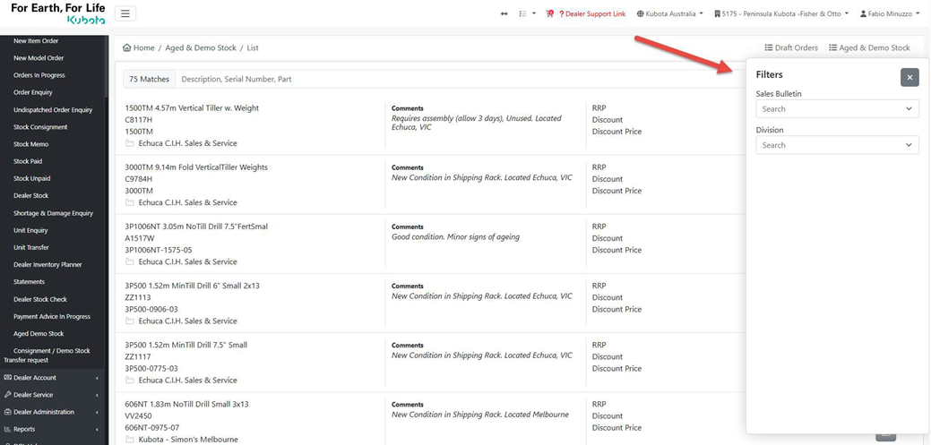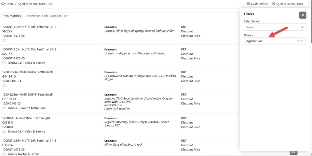 You are able to further refine your order selection by using the Filter functionality. You are able to filter by Sales Bulletin and Division
