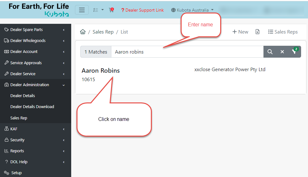 - From the Left menu side of Dealer on Line select “Dealer Administrator> Sales Rep”